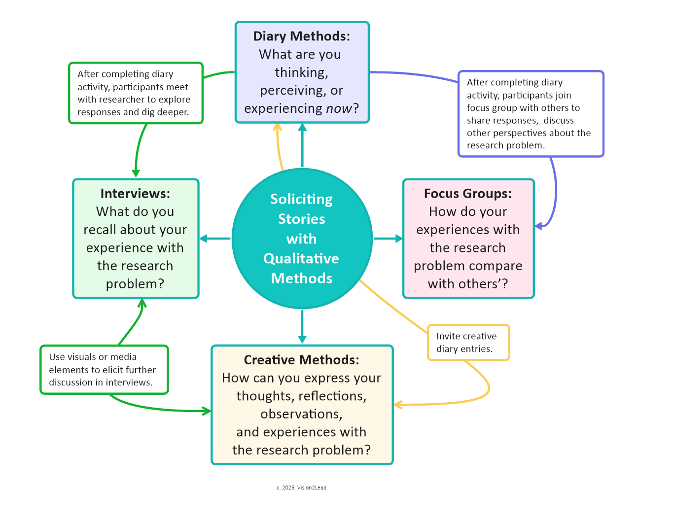 Diary and other methods can be fruitfully combined. An interview after the diary sequence allows you to ask for clarification or follow-up. Creative methods invite participants to use art journaling, including making analog entries and scanning them to share, or to sharing visual or multimedia responses. In a post-diary focus group participants can discuss and build on each other’s responses. Additionally, diary methods can be combined with quantitative approaches for mixed methods studies.