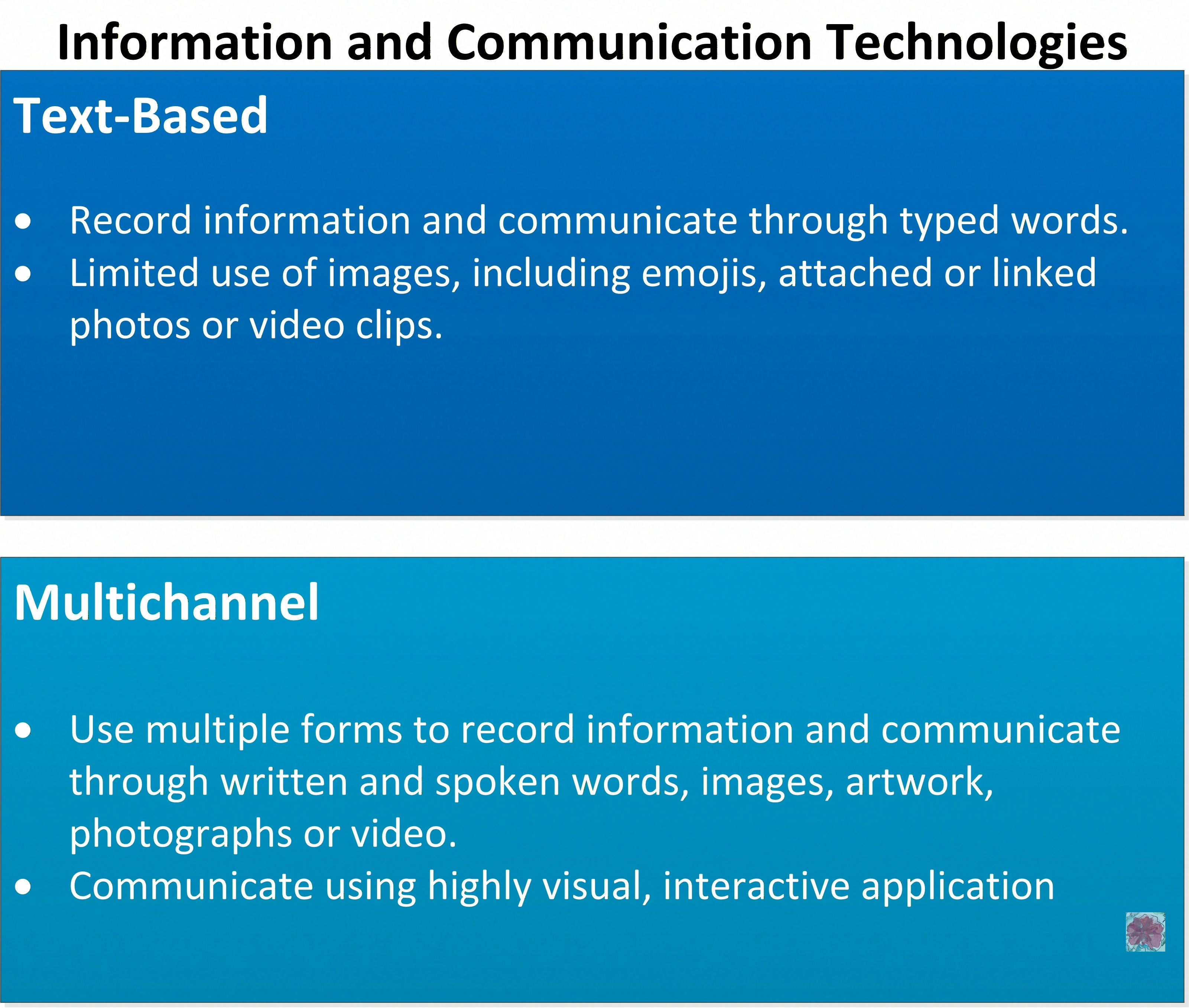 Some ICTs primarily use text. Even when visual elements such as color, emoticons or emoji are added, images or videos embedded, the written word is primary. Other technologies allow for a mix of audio or voice, video, and/or visual communications exchanges. Here these are described as multichannel ICTs.
